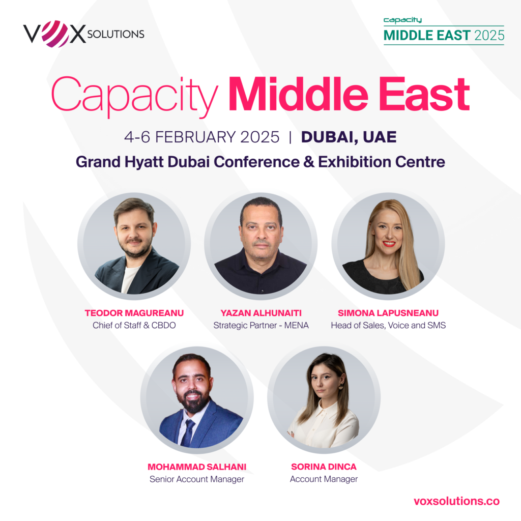 Nos complace anunciar que nuestros colegas, Teodor Magureanu – Chief of Staff & CBDO, Yazan Alhunaiti y Ahmad Khalaf – Seniors Strategic Partnerships on MENA, Simona Lapusneanu – Head of Sales, Voice and SMS, Sorina Dinca y Mohammad Salhani – Seniors Account Managers, nos representarán en este gran evento.