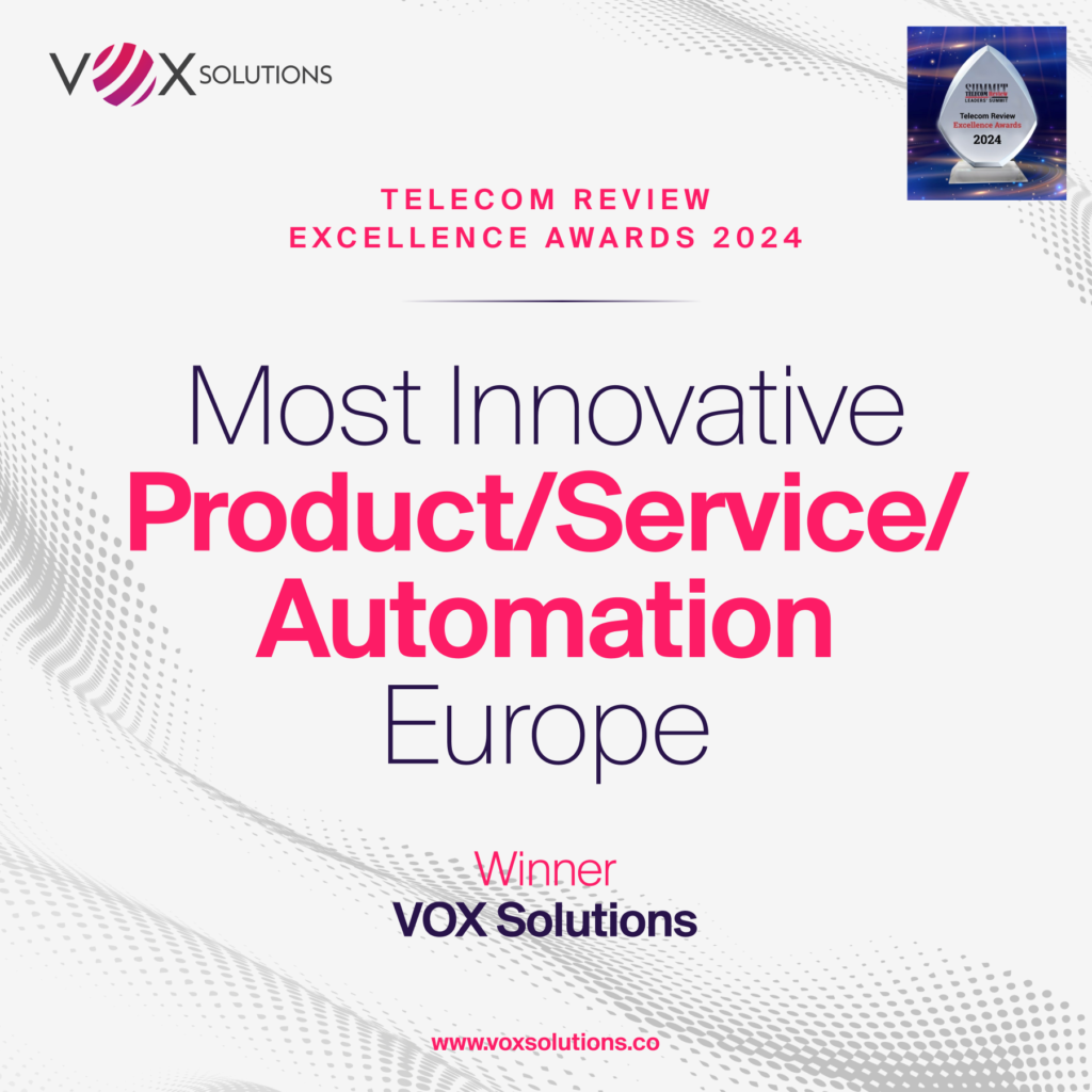 Estamos encantados de anunciar que nuestra solución VOX360 ha sido reconocida en los premios Telecom Review Excellence 2024, ¡ganando un puesto en la categoría de “Producto/Servicio/Automatización más innovador de Europa”!