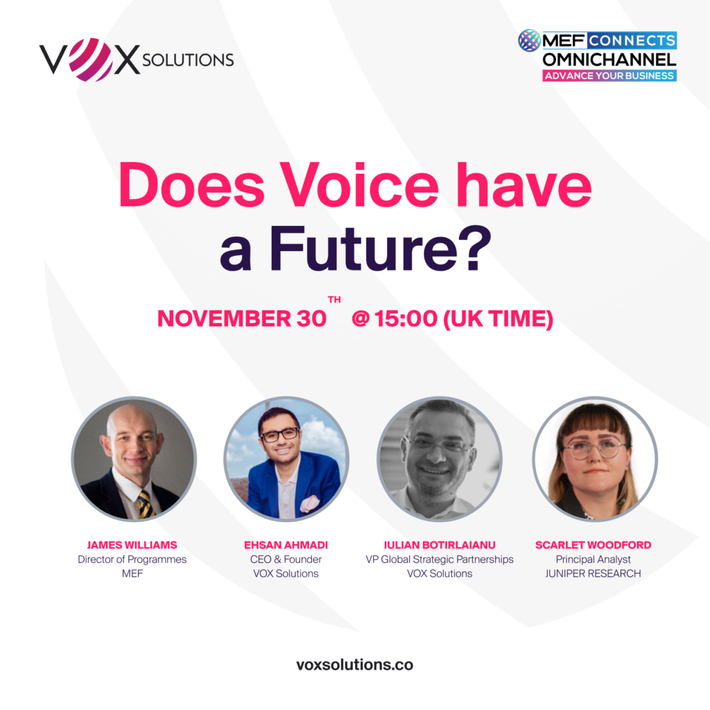 As part of Mobile Ecosystem Forum Connects Omnichannel event, VOX SOLUTIONS has put together a panel discussion at 3:00 PM GMT on November 30th, looking closely at both all the challenges and opportunities. Moderated by James Williams, you’ll be seeing our CEO & Founder, Ehsan Ahmadi, our Chief of Staff – Teodor Magureanu and our Global VP of Strategic Partnerships, Iulian Botirlaianu as well as Principal Analyst Scarlett Woodford from Juniper Research in action, speaking on: