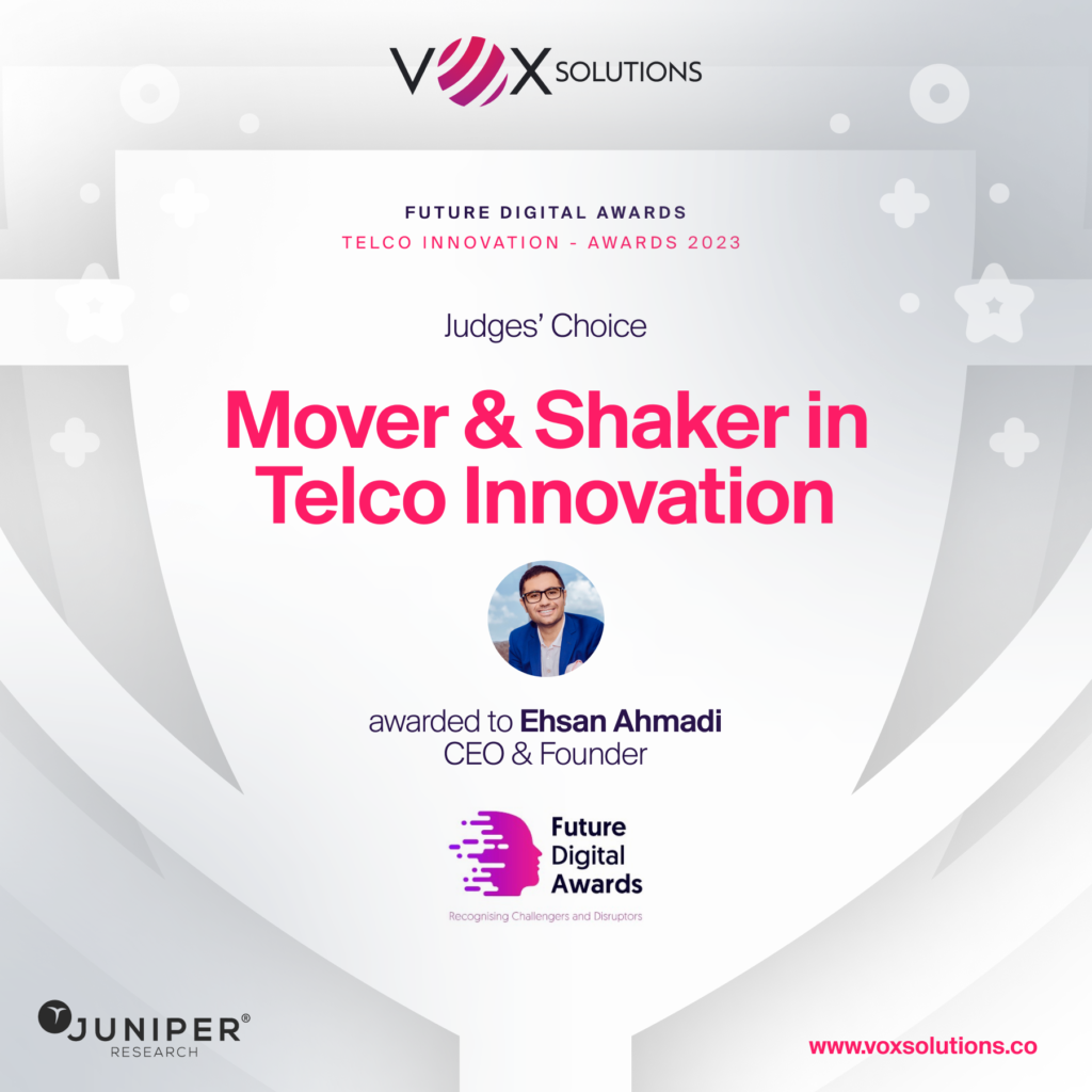 What our CEO says: “I am excited for VOX SOLUTIONS to receive the award for Best Flash Call Authentication Solution for a second time in a row, as well as for myself to receive the Industry Mover & Shaker Award in Telco Innovation at Future Digital Awards by Juniper Research!