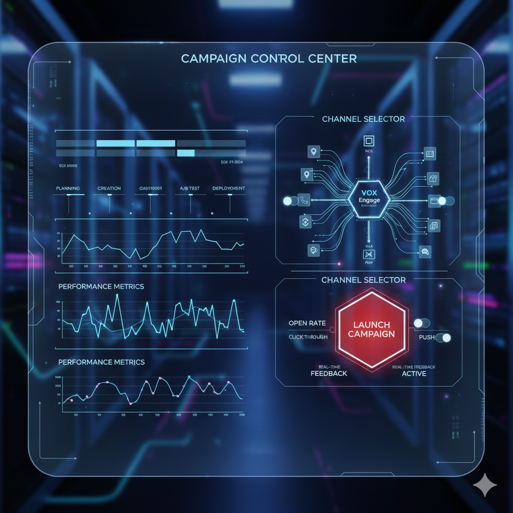 VOX Engage is the campaign execution engine that activates the insights from the Vector Graph. It is a multi-channel CPaaS (Communication Platform as a Service) designed specifically for advertising.